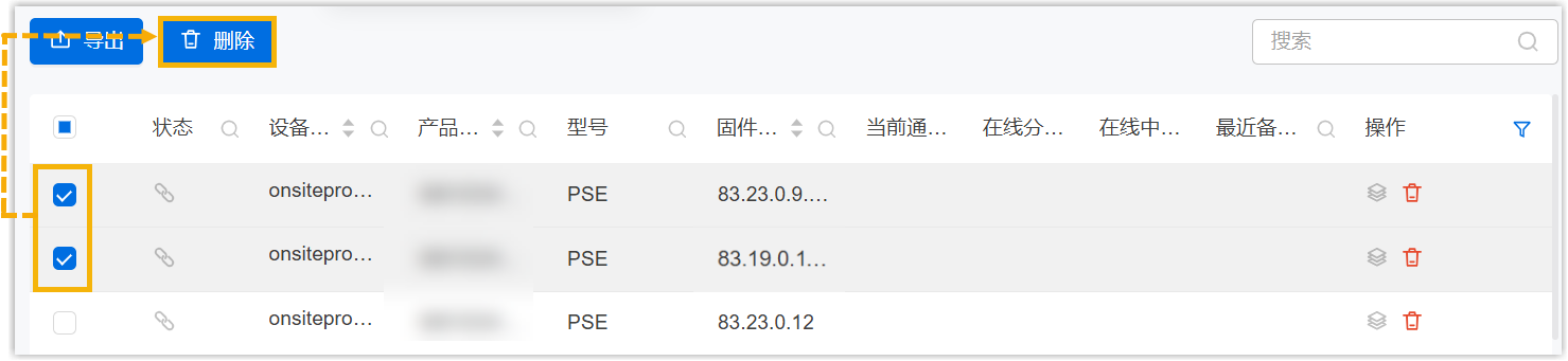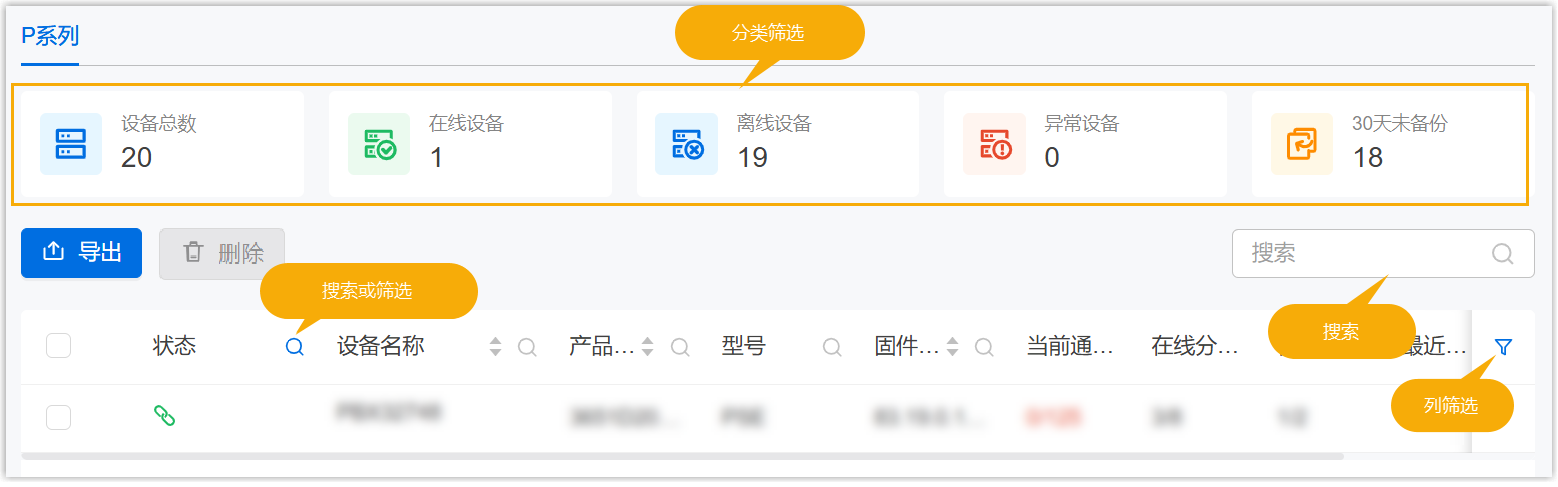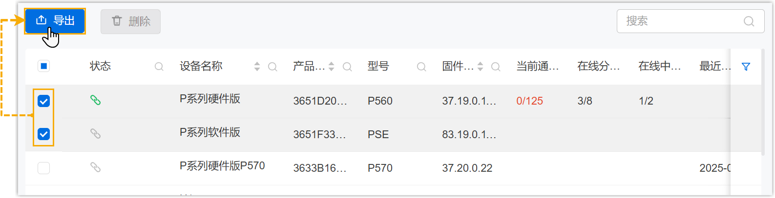 - 要导出一到多台设备的信息,勾选所需设备,然后点击 导出。