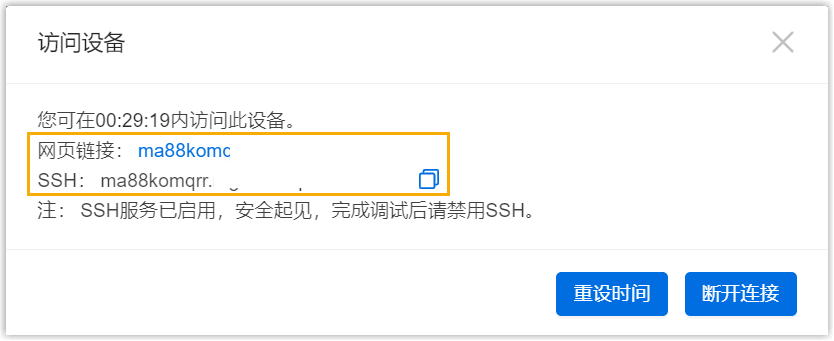 - 弹窗中显示用于远程 Web 访问和 SSH 访问的访问信息。