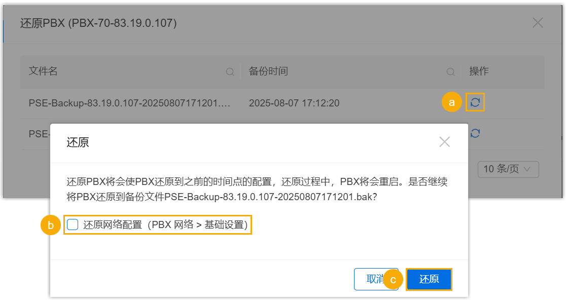 Yeastar 统一管理平台支持从备份包还原 P 系列硬件版/软件版,该备份包可以由本设备或同型号的另一台 PBX 设备生成。