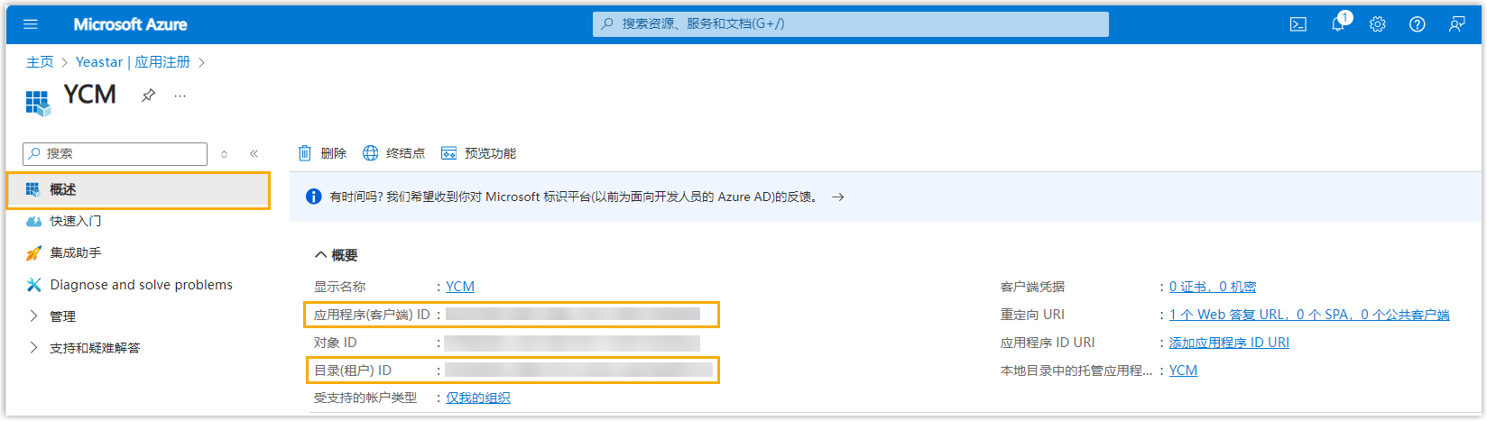 记录此应用程序的 应用程序(客户端) ID 和 目录(租户) ID,后续需要在 Yeastar 统一管理平台中填入此信息。