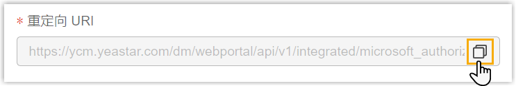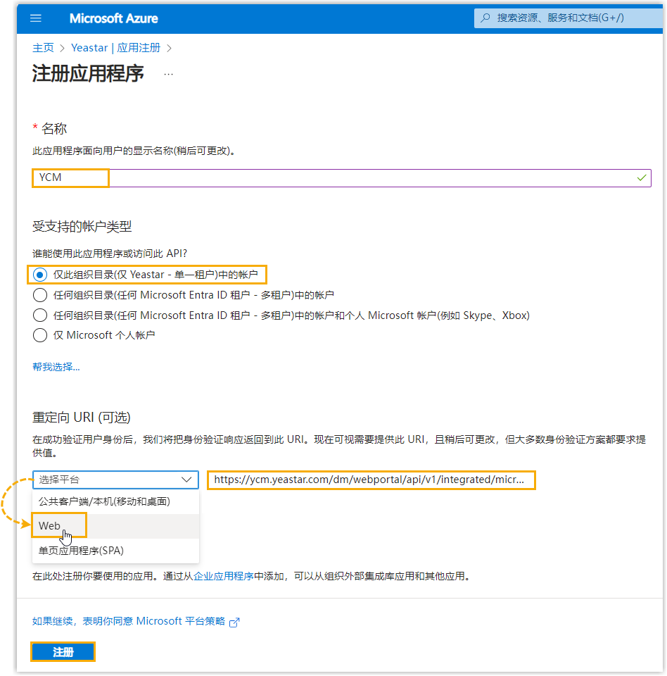 - 重定向 URI:在 选择平台 下拉列表,选择 Web,然后粘贴从Yeastar 统一管理平台中获取的 重定向 URI。