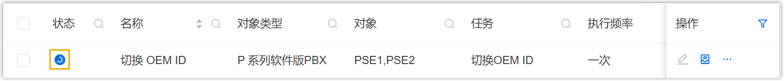 设置 说明 名称 填写一个名称,帮助你识别该任务。 对象类型 保持 P系列软件版PBX。 任务 选择 切换OEM ID。 目标OEM ID 选择目标 OEM ID。 执行频率 保持 一次。 执行时间 勾选 立即。 时区 此项不可编辑。 创建者 此项默认读取你的名字,且不可编辑。 备注 可选。添加备注信息。 Object 已选择 框中列出你所选择的 P 系列软件版。 - 点击 保存。