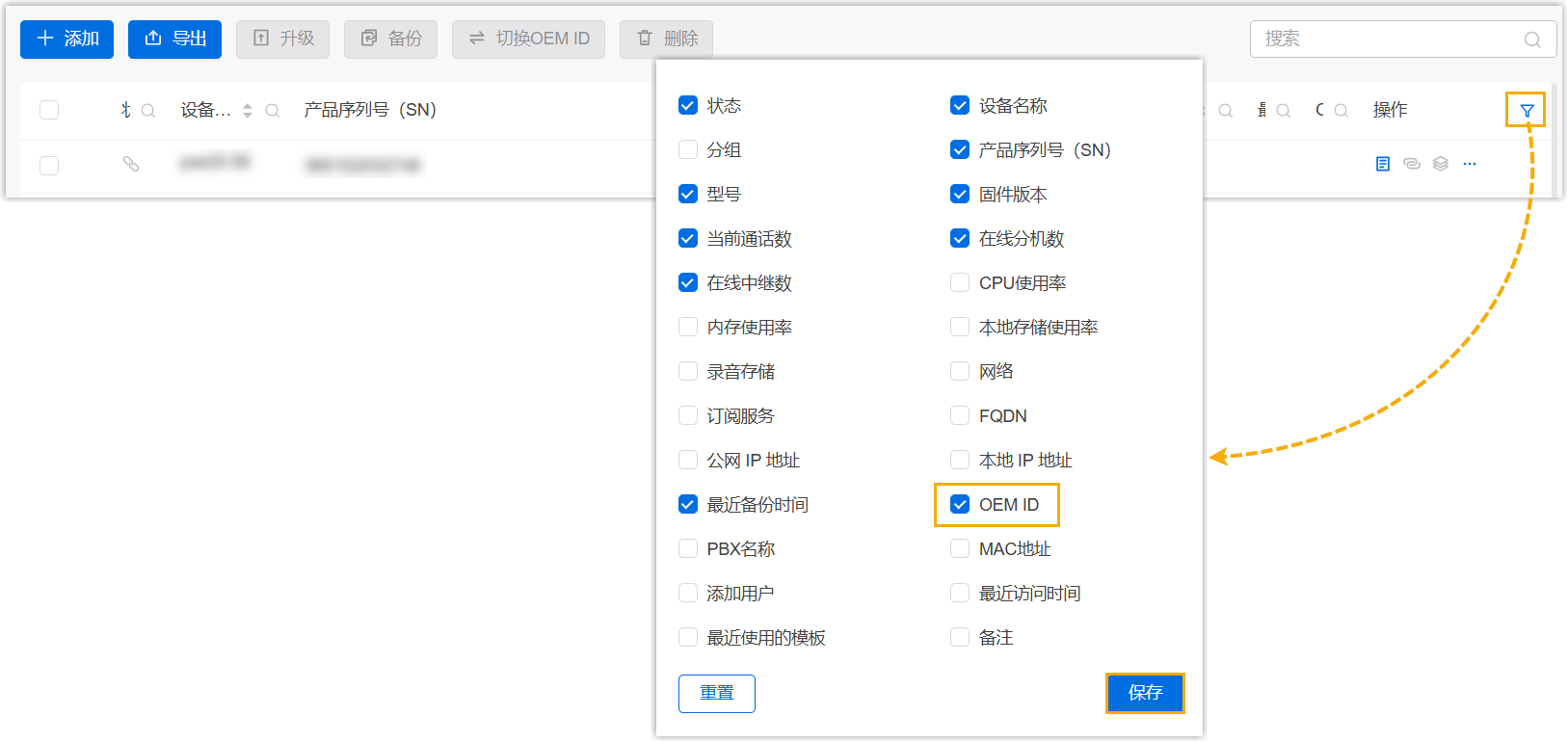 - 在设备列表中,设置顶部栏,已显示 PBX 的 OEM ID。