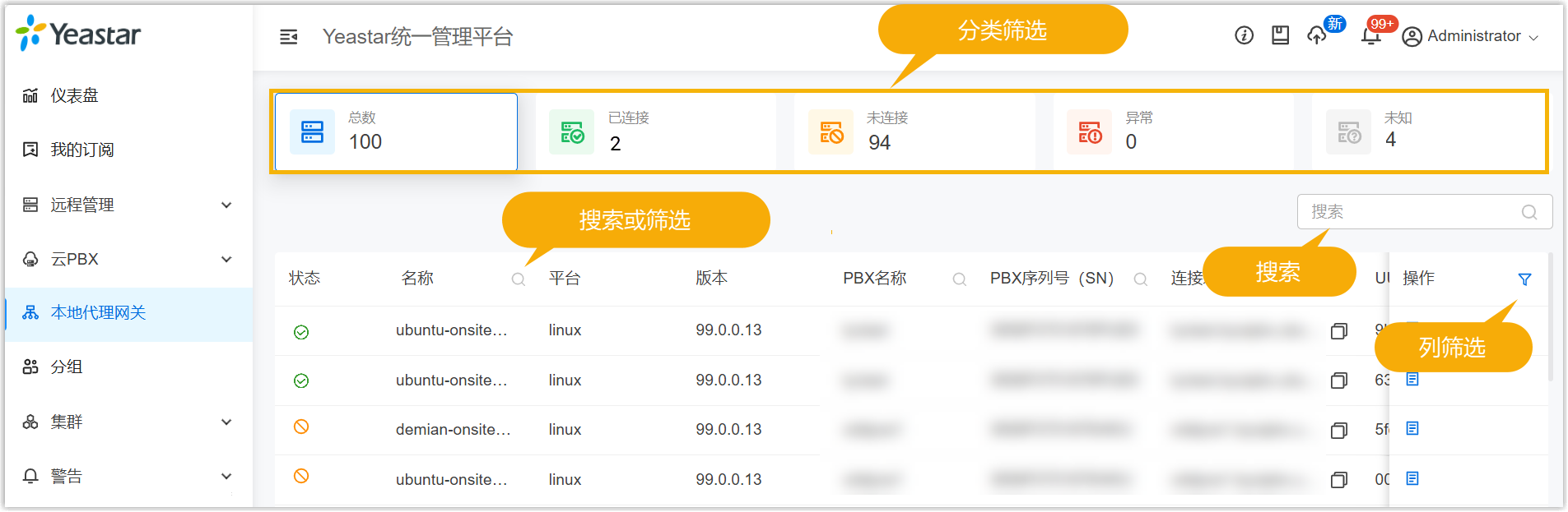 本文介绍如何在 Yeastar 本地代理网关 (Onsite Proxy) 实例总览列表中查看多台 PBX 上的实例。你可以一览每个实例的当前状态,并查看实例的详细信息。