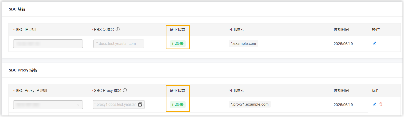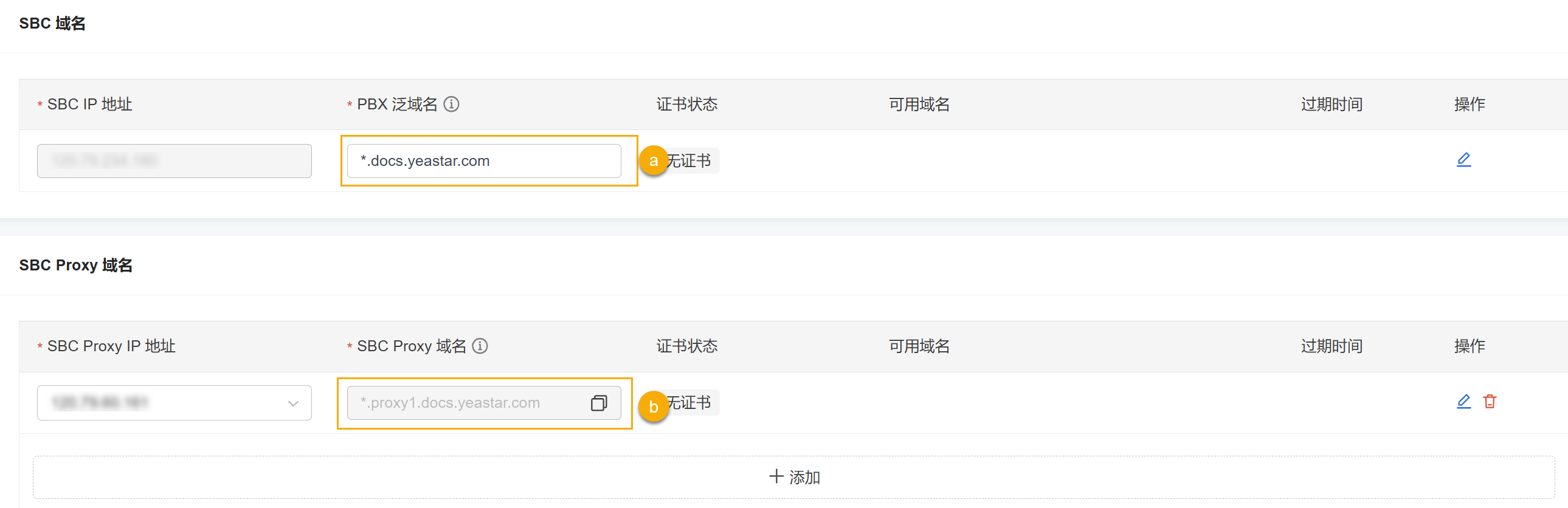 例如:域名 IP地址 PBX 泛域名 *.docs.yeastar.comSBC IP 地址 123.123.123.123SBC Proxy 域名 *.proxy1.docs.yeastar.comSBC Proxy IP 地址 124.124.124.124