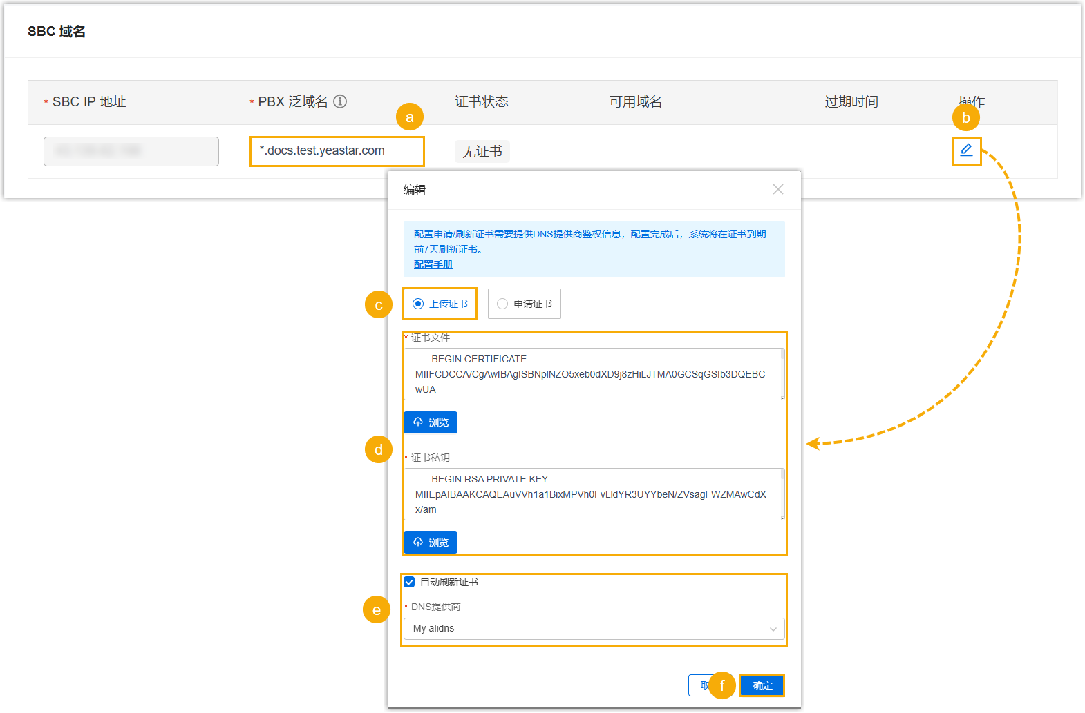- 在 SBC 域名 部分,配置 SBC 服务器的域名和证书。