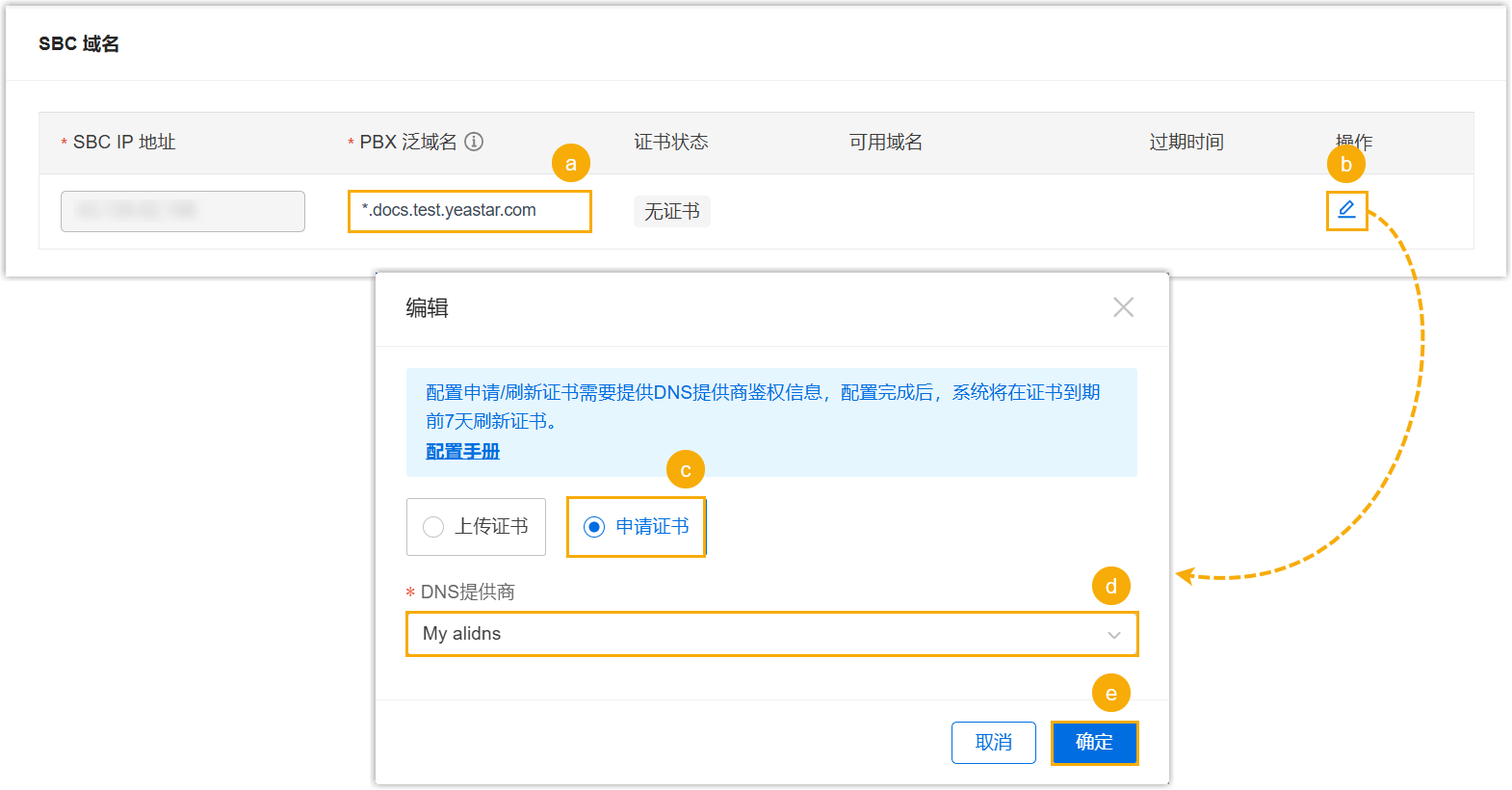 - 你可以直接在Yeastar 统一管理平台上申请证书,系统会自动通过你的 DNS 提供商向 Let's Encrypt 请求域名证书。