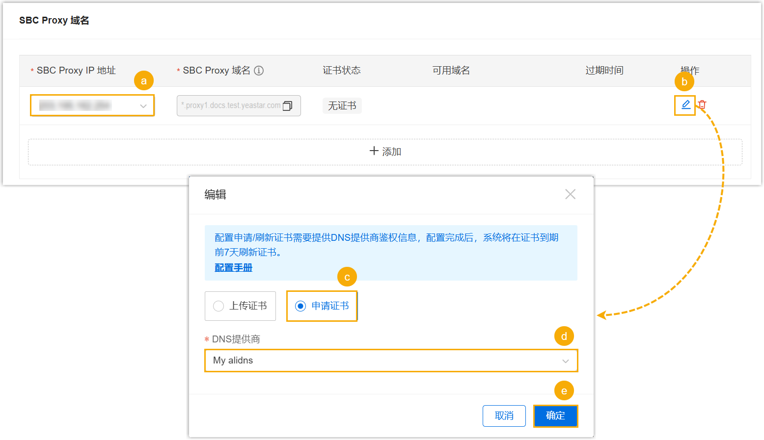 - 在 SBC Proxy 域名 部分,配置 SBC Proxy 服务器的域名和证书。