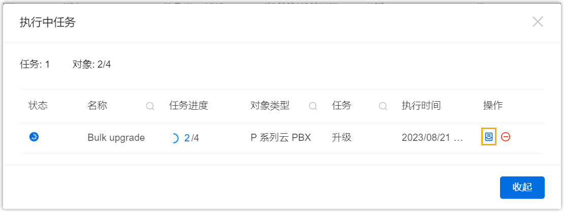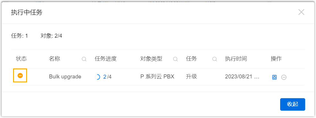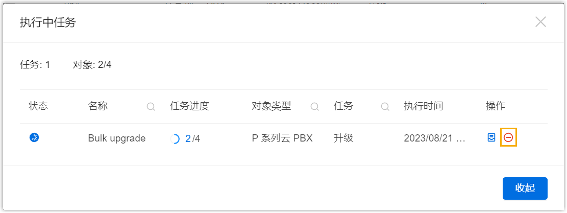 如果系统中有正在执行中的任务,Yeastar 统一管理平台上会显示一个浮窗,你可以在此处快速查看任务执行详情和进度,或终止正在执行的任务。
