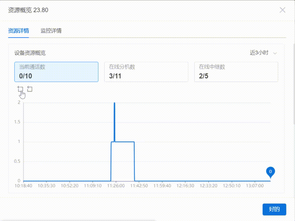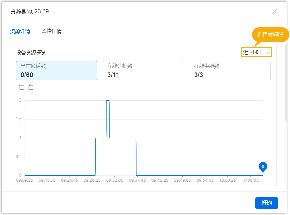 | 当前通话数 | 显示当前通话数与支持的总通话并发数的比率,并提供在所选时间段内的数据趋势和每个时间点的详细信息。 |
