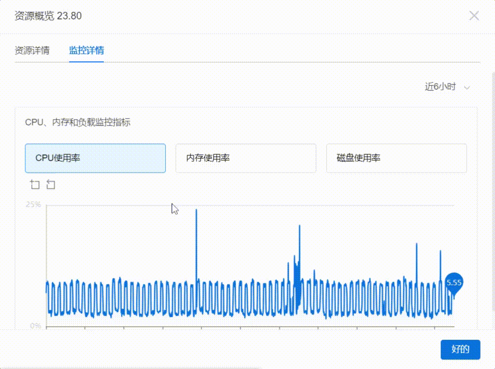 | CPU 使用率 | 显示所选时间段内已消耗 CPU 占总 CPU 的百分比。 |