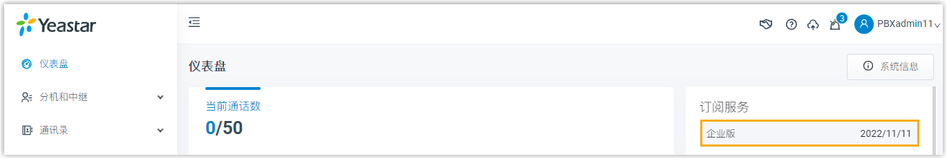 在 PBX 管理网页,到期提醒的横幅消失,订阅服务的过期时间更新。