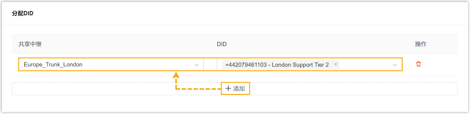 5. 可选:分配DID 栏,点击 添加 为 PBX 分配 DID 号码,以实现中继共享。