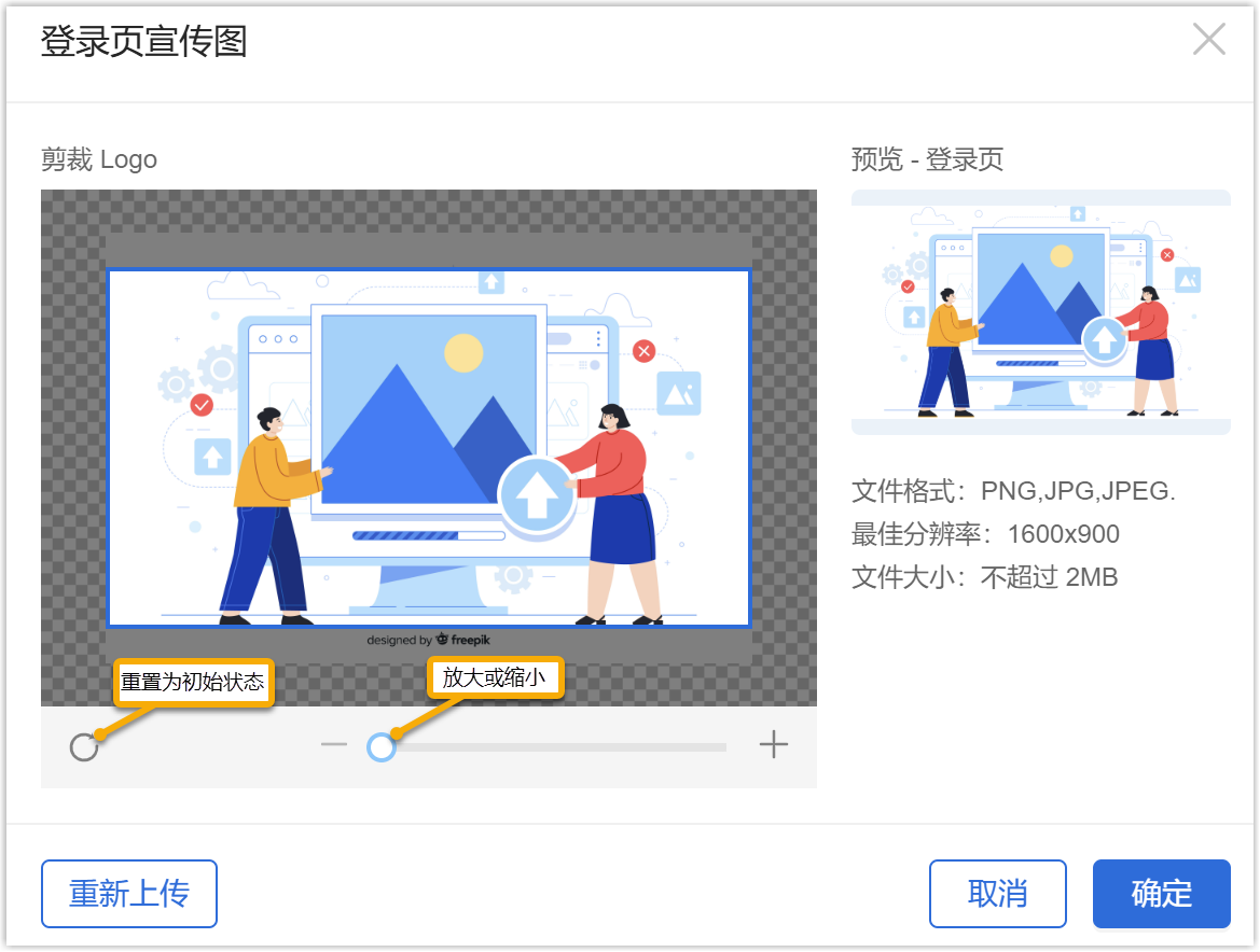 登录页宣传图 上传一张宣传图片,该图片将显示在平台登录页面的左侧。 注: 图片应满足以下要求:- 文件格式:PNG、JPG 或 JPEG