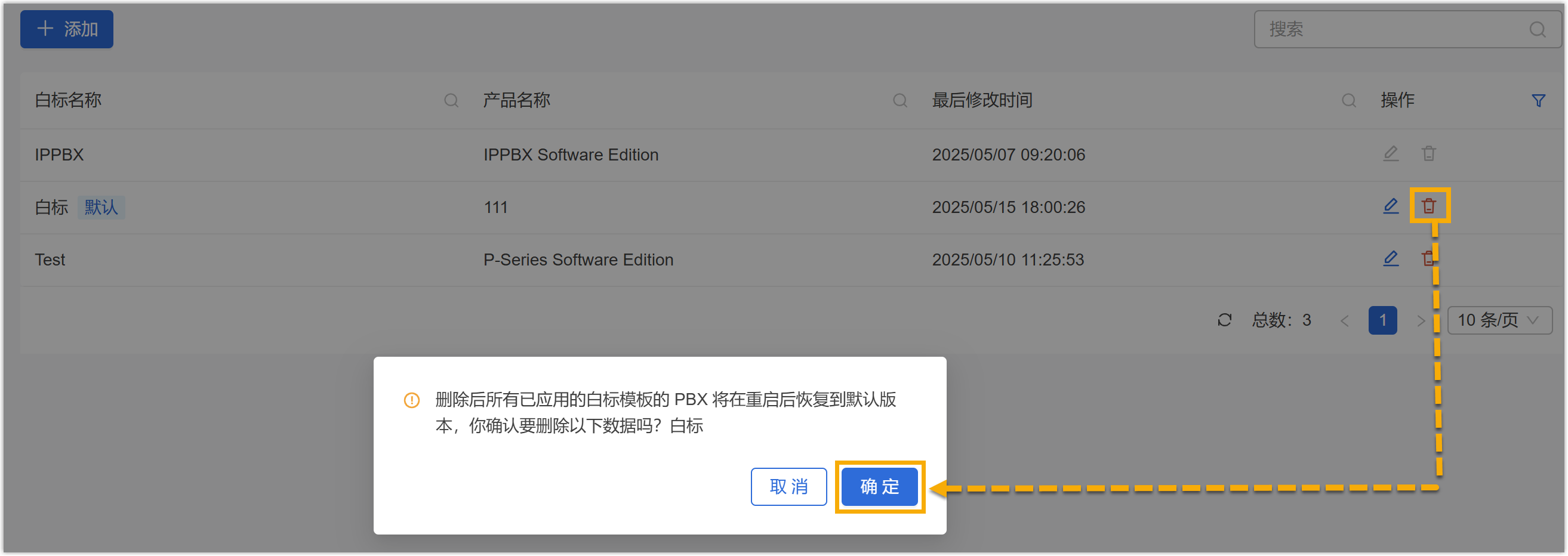 删除 P 系列软件版的白标模板 如果不再需要白标模板,你可以在 Yeastar 统一管理平台中将其删除。 操作步骤 登录 Yeastar 统一管理平台,进入 软件版PBX > 白标服务。 在白标模板右侧,点击 ,然后点击 确定。 执行结果 白标模板已从 Yeastar 统一管理平台中删除,并且无法再通过伙伴门户访问。 所有已应用该白标模板的软件版 PBX 在重启后将恢复为默认版本。