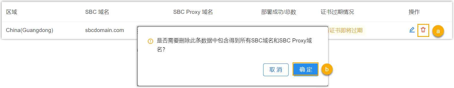 - 要删除某个区域内的 SBC 和 SBC Proxy 服务器域名,请执行以下操作:注: 删除前确保当前没有正在使用此域名的云 PBX,否则无法删除域名。