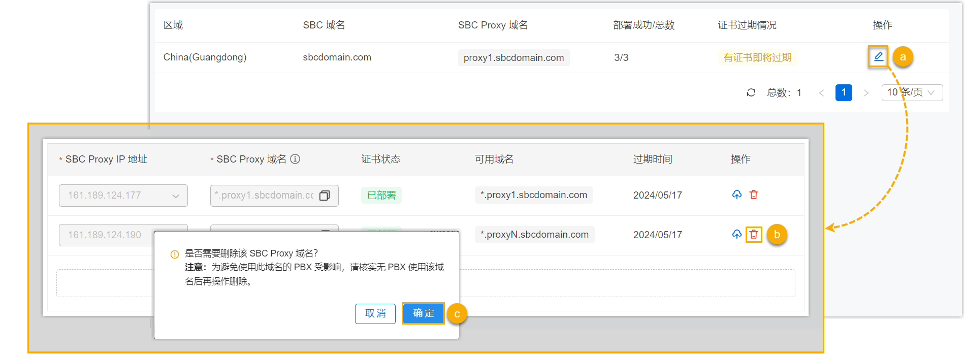 - 若区域内仅部署单台 SBC Proxy 服务器,则不支持单独删除该 SBC Proxy 服务器的域名。