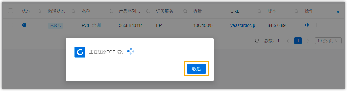 ,且页面弹出窗口,提示 PBX 系统正在还原。提示: 你可以点击 收起,将窗口折叠到右下角。