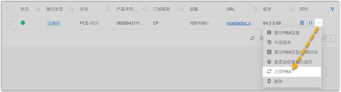 ,然后选择 还原PBX。