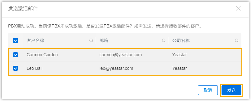 - 在弹出的窗口中,选择接收邮件的客户,然后点击 发送。注: 可选的客户即你在创建 PBX 时所添加的客户。如需更改客户,请参见 更改云 PBX 激活邮件的收件人。