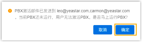- 如果 PBX 未运行,点击 确定 马上启动 PBX,否则用户无法访问并激活 PBX。