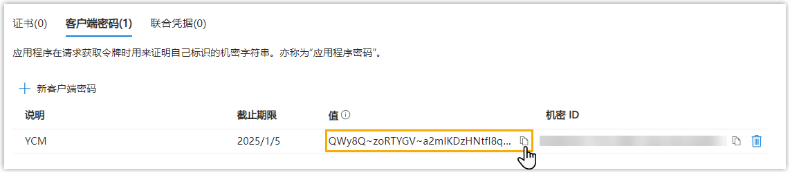 - 记录客户端密码的 值,以便后续使用。重要: 客户端密码只显示一次。务必在离开此页面前记录下客户端密码的值,否则你需要重新创建一个密码。