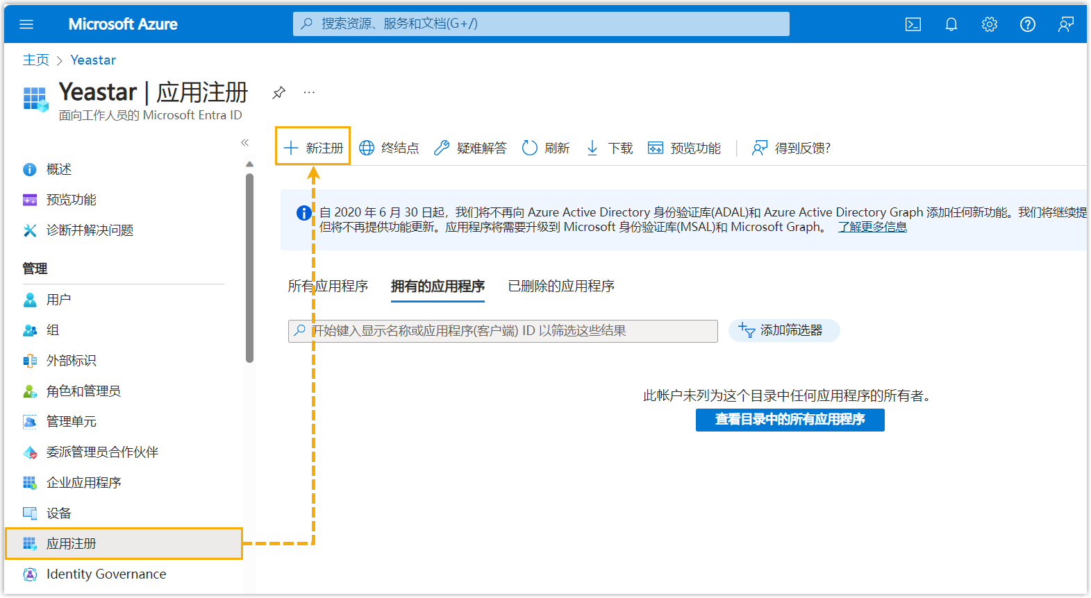 - 在组织目录的左侧导航栏,进入 应用注册,然后点击