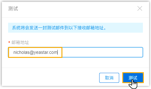 - 在弹出的窗口中,在 邮箱地址 字段填写一个用于接收测试邮件的邮箱地址,接着点击