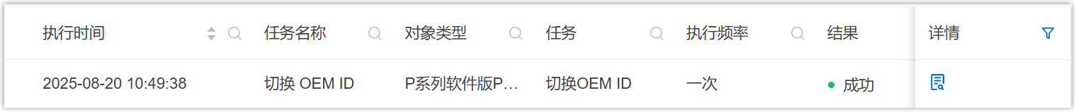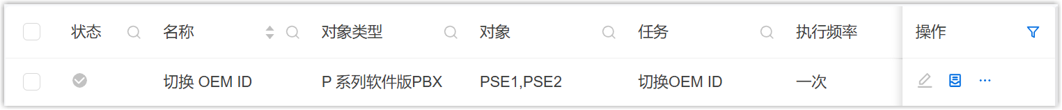 设置 说明 名称 填写一个名称,帮助你识别该任务。 对象类型 保持 P系列软件版PBX。 任务 选择 切换OEM ID。 目标OEM ID 选择目标 OEM ID。 执行频率 保持 一次。 执行时间 勾选 立即。 时区 此项不可编辑。 创建者 此项默认读取你的名字,且不可编辑。 备注 可选。添加备注信息。 Object 已选择 框中列出你所选择的 P 系列软件版。 - 点击 保存。