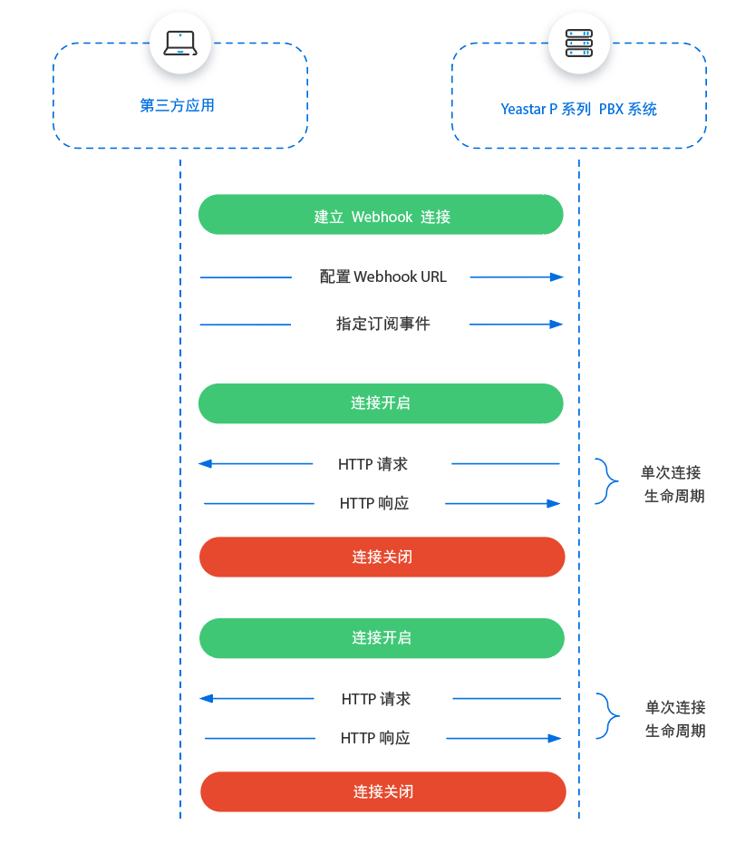 在 Yeastar 统一管理平台配置 Webhook URL 并指定订阅事件后,当指定的事件发生时,系统会自动将事件通知推送给第三方应用。每次系统发送事件通知时,第三方应用应返回表示成功的 HTTP 响应